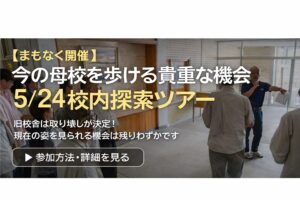 2026年5月24日(日)の総会と校内探索ツアーで、久しぶりに母校を一緒に歩きませんか。現在の校舎は大部分の取り壊しが決定しております。近年の工事費高騰の影響により、解体時期が当初予定より遅くなる可能性もございます。ただし、いずれにしても現在の姿の母校を見られる機会は限られており、今回がその貴重な機会の一つ、もしかすると最後になるかもしれません。思い出の詰まった校舎を歩ける大切な時間となります。ぜひぜひ多くの方にご参加いただきたくお待ちしております。参加希望の方は、お手数ですがお問い合わせフォームから事前にご連絡ください。